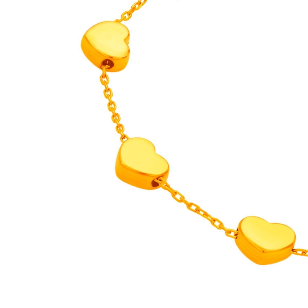 The 916 Gold Heart Bound Bracelet features 3D heart charms lined along a classic box chain, creating a sweet and playful vibe. For the ones who love to express their style with a playful edge.