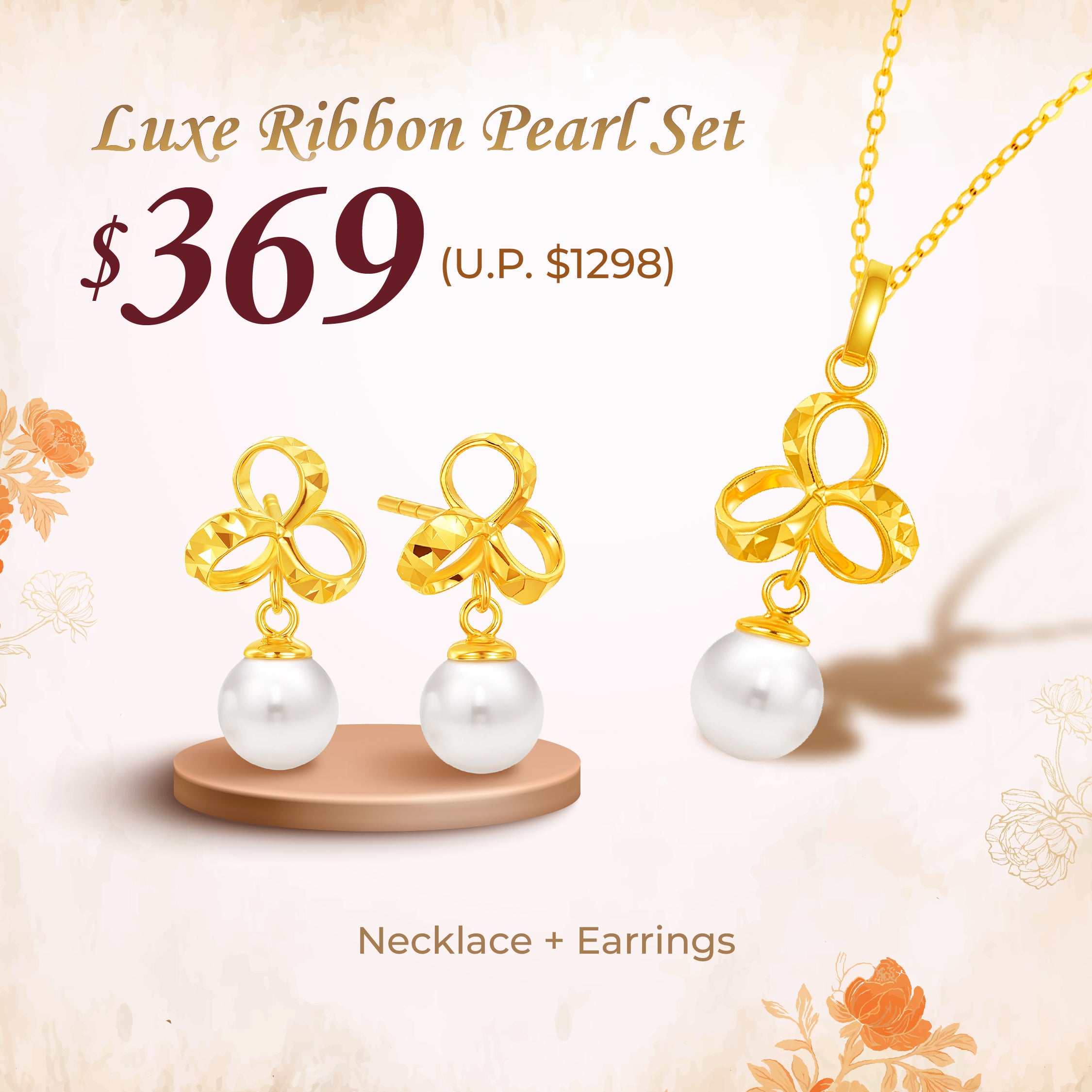 - 1 x MoneyMax Jewellery 10K Gold Luxe Ribbon Pearl Earrings/Pendant/Set (MPE071/MPP215)