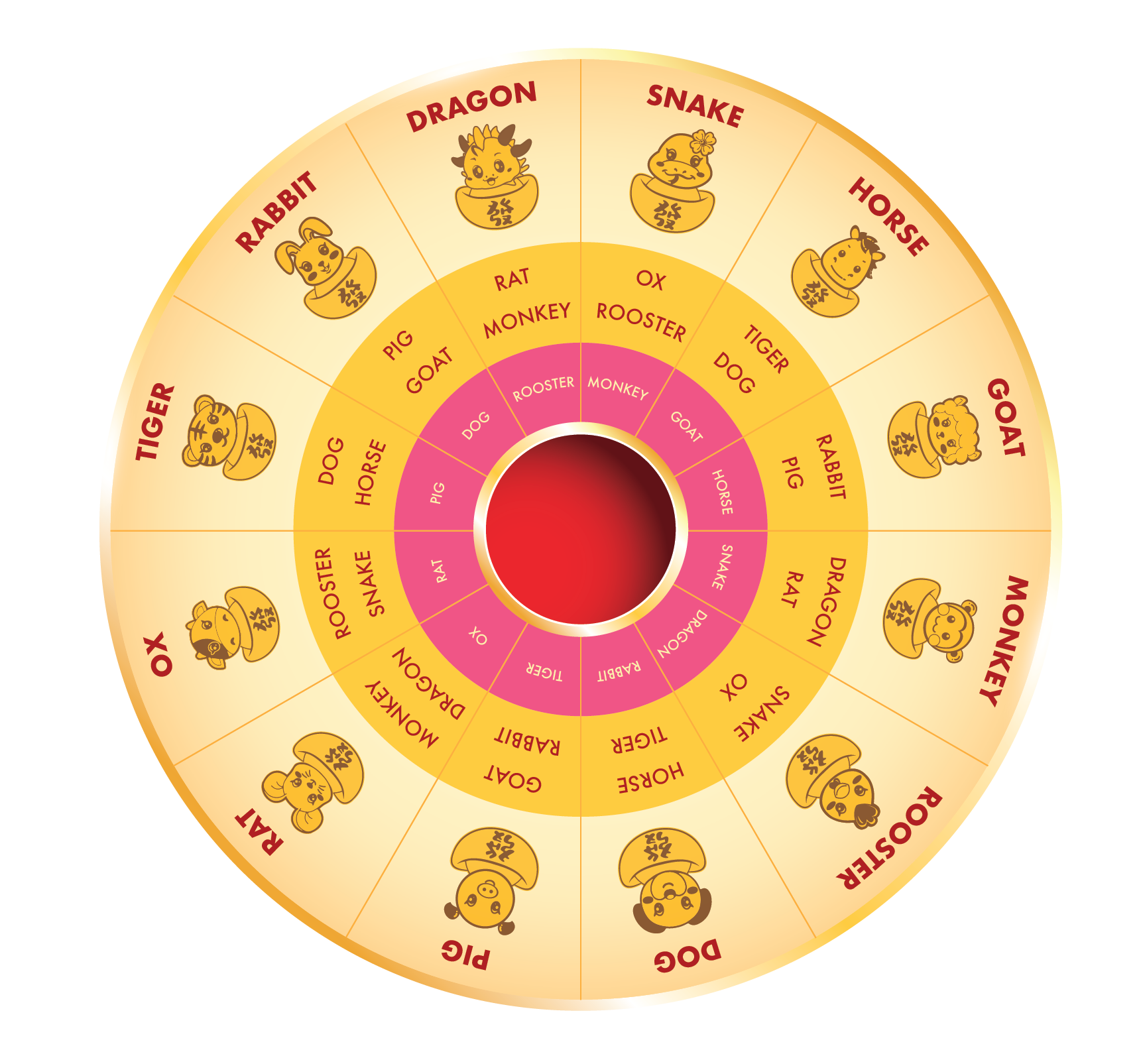 The 12 Chinese Zodiac animals are:
