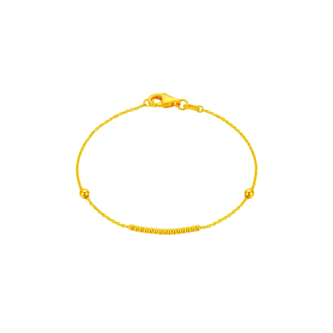 The 916 Gold Petite Bead Bracelet redefines everyday luxury with its slim profile and refined beadwork. Featuring a precise row of polished gold spheres centered on a fine-link chain, it offers a dainty feel with a brilliant golden shine. Perfect for stacking with your favorite timepiece or wearing alone for a touch of sophisticated sparkle.