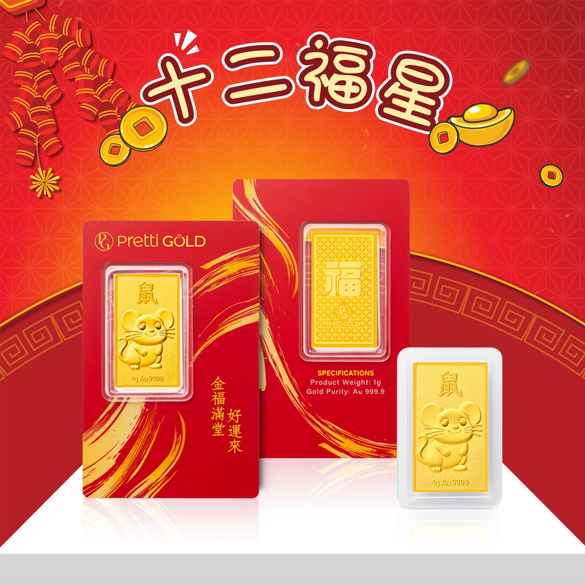 • 1 x MoneyMax Jewellery 999 Gold 十二福星 12 Lucky Treasures Zodiac Pretti Gold Bar (BAR064)